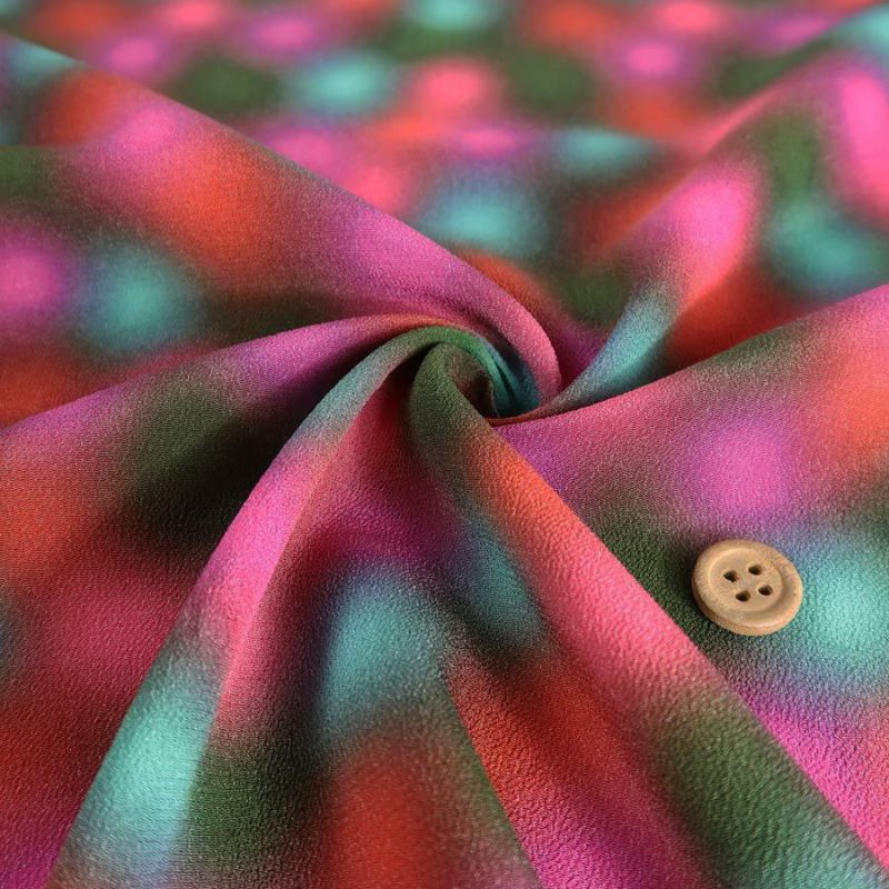 多色のぼかし柄は一越ちりめんでは少ないので、オリジナルで企画しています。色が重なった部分には新しい色が生まれ、複雑な色のグラデーションを楽しんでいただけます。