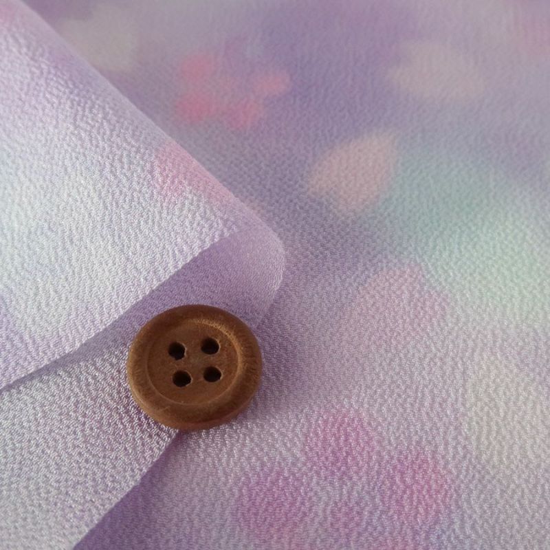 一越ちりめんには珍しいクリアーな色使い。淡い紫にピンクや水色などのぼかし柄が重なり合って、はんなりとやさしい華やかさです。ランダムなムラ染めのようですが、よく見ると桜の花びらや梅鉢の模様が見えるやさしいぼかし柄です。