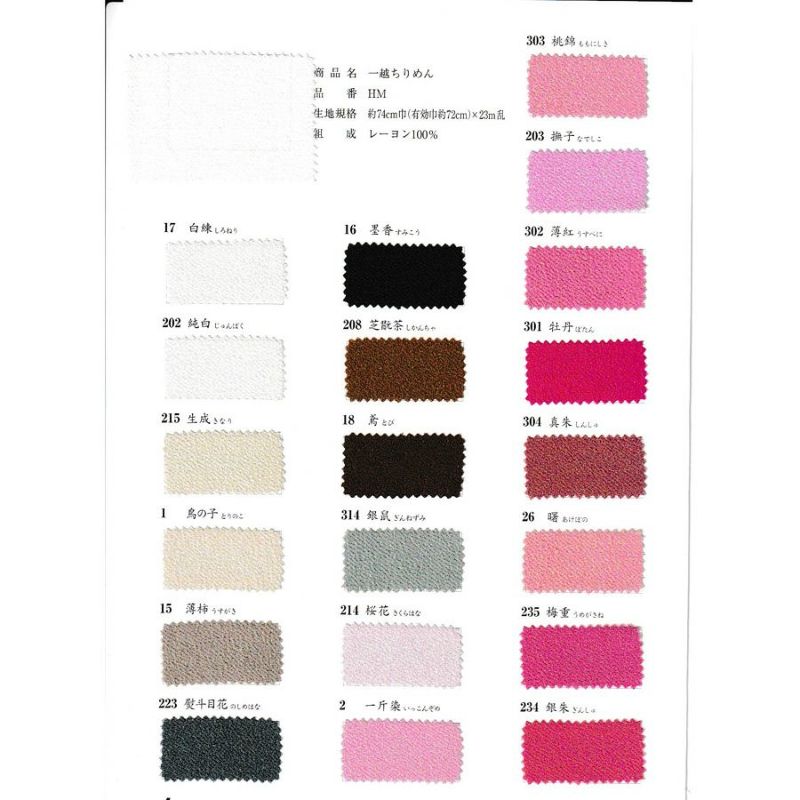 商品案内(株)西村庄治商店による「西村ちりめん」無地一越ちりめんの色見本帳です。