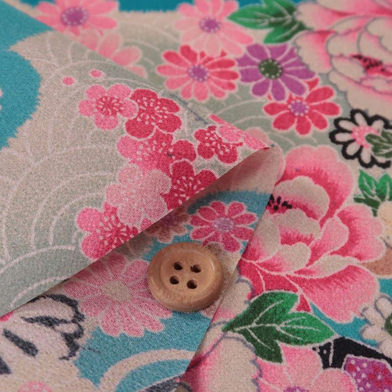 このちりめんは手捺染~布の上に型を置き、人の手によって染めていく方法で染色されました。機械染めよりはるかに手間がかかりますが、機械では不可能な多色使いにより深みのある精巧な染めが可能です。実物をご覧いただくと納得していただけると思います。