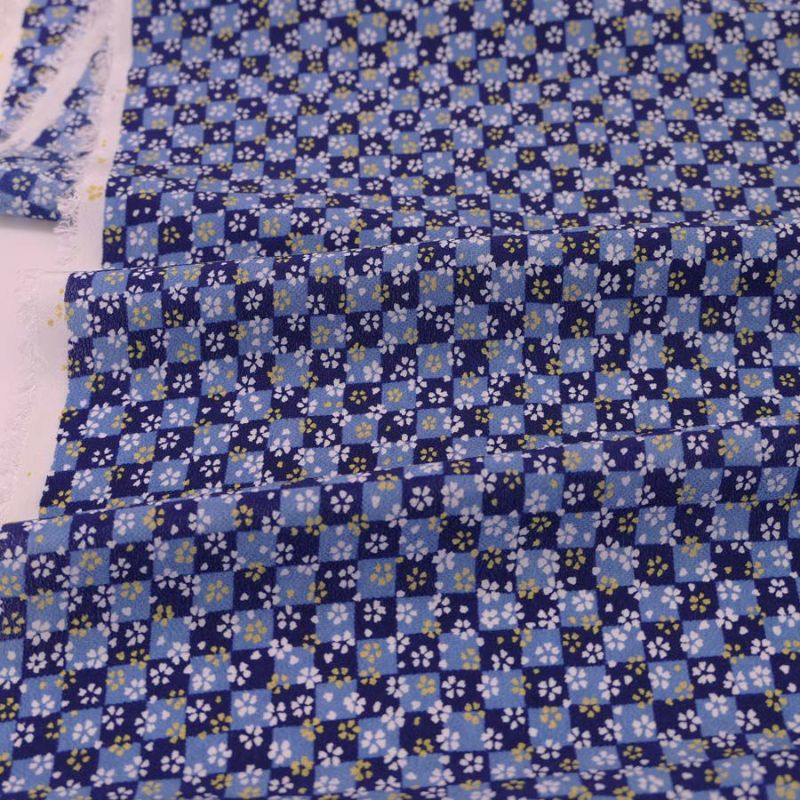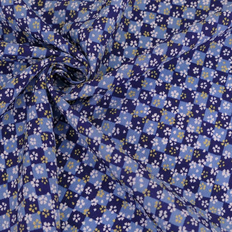 商品案内濃淡の青の市松柄の背景に2色の小桜が散らされた一越ちりめん。