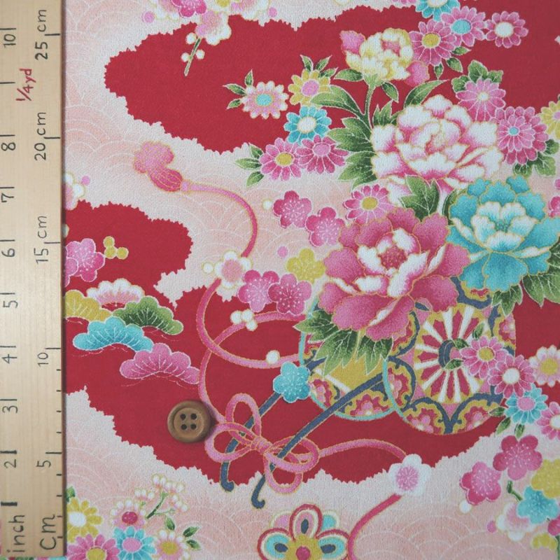 華やかな花御所車柄が素敵♪ 一越ちりめん生地 花御所車に手まり(オレンジ) 10cm単位 切り売り