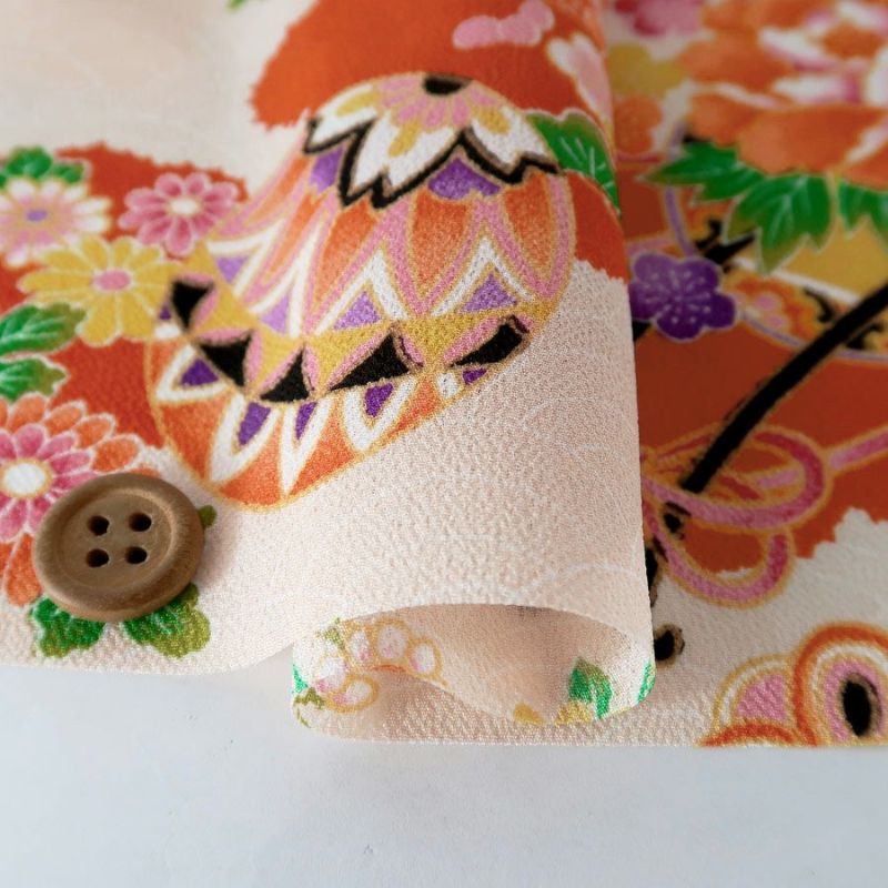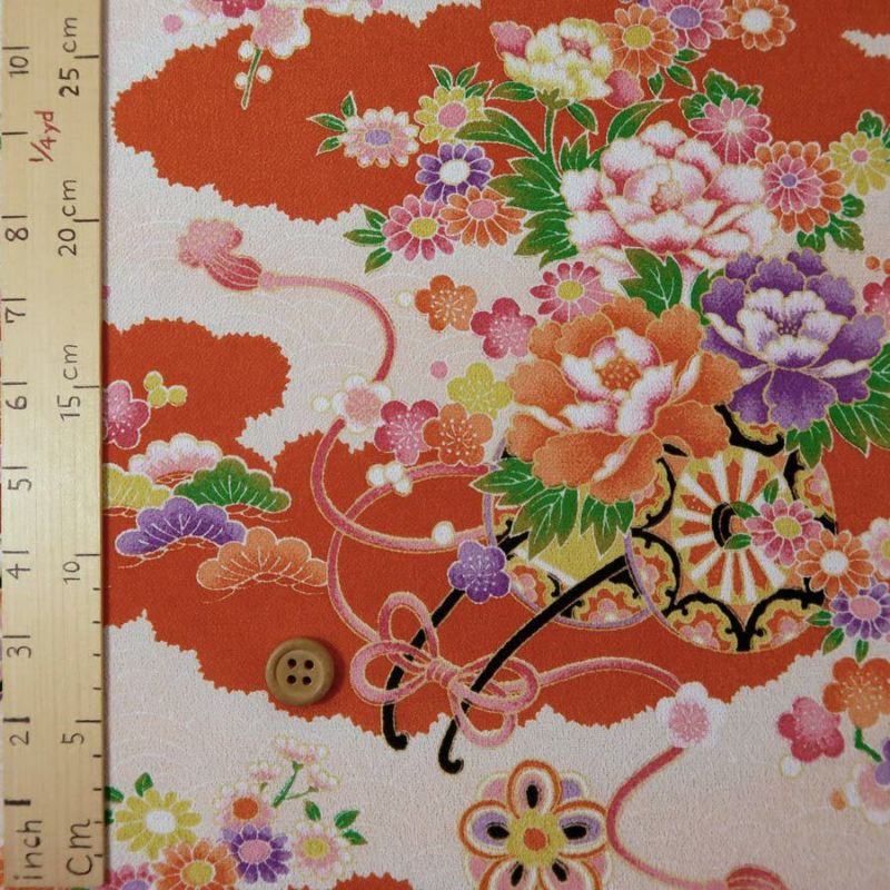 華やかな花御所車柄が素敵♪ 一越ちりめん生地 花御所車に手まり(赤) 10cm単位 切り売り