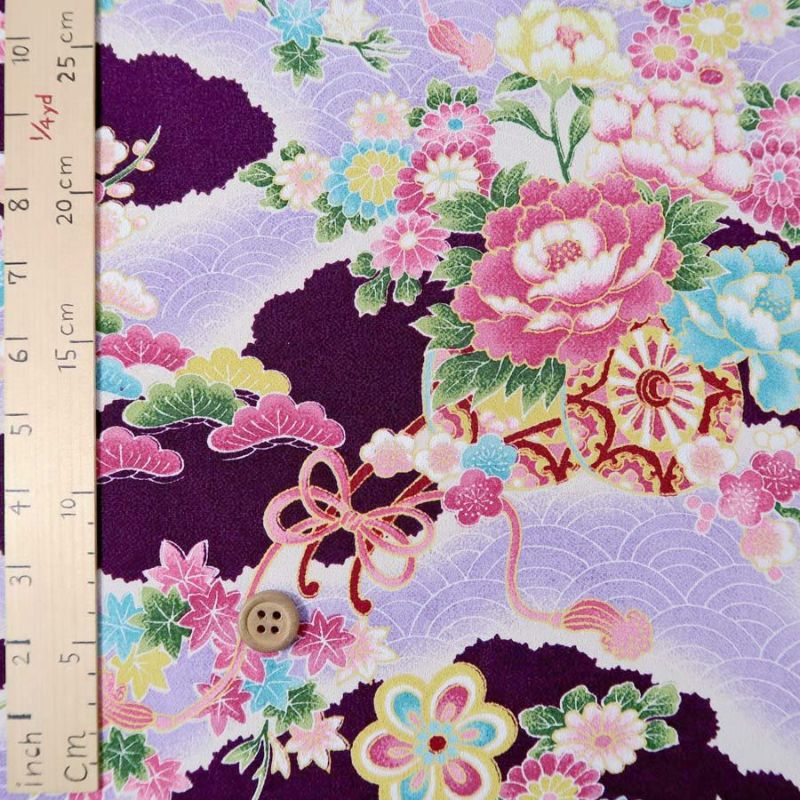 華やかな花御所車柄が素敵♪ 一越ちりめん生地 花御所車に手まり(紫) 10cm単位 切り売り