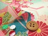 ●トルコブルー系のあざやかな青の背景色と水色の鹿の子柄の組み合わせがすっきりと爽やかな印象。ピンク系の柄がかわいさをそえています。