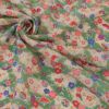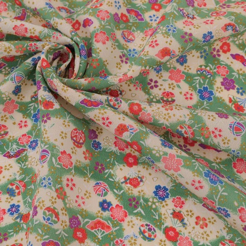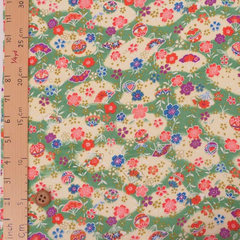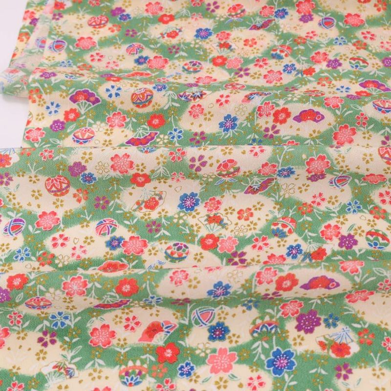 金彩がキラキラきれいな縮緬 在庫限り/小シボ(一越)ちりめん生地 小まりと扇の花便り(若竹色) 10cm単位 切り売り