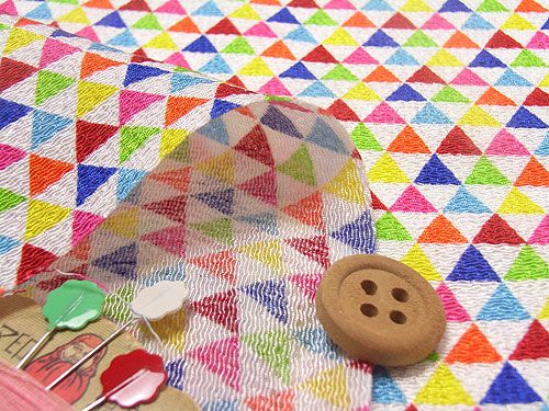 ポップな柄のちりめん生地は新鮮です!三角形をつないだこの模様は、「鱗(うろこ)」と呼ばれる伝統文様です。こんなにカラフルで明るい色使いになると、とても楽しい雰囲気になりますね。三角形の1辺の長さは1cm弱ぐらいです。