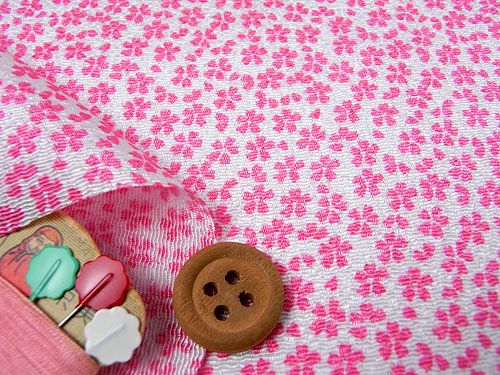 商品案内 白地にピンクの小桜が一面に咲く、可憐な柄のちりめん生地です。