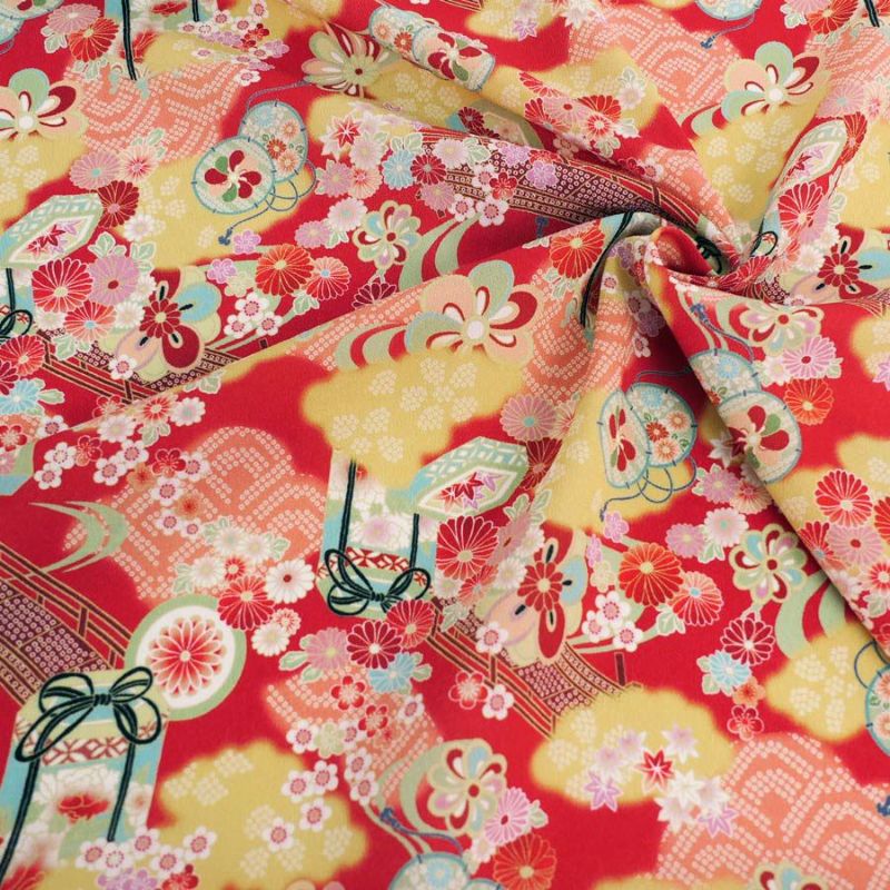 縮緬手芸に上品な古典柄 一越ちりめん生地 貝桶と花鼓(黒/赤)【布がたりオリジナル】 10cm単位 切り売り