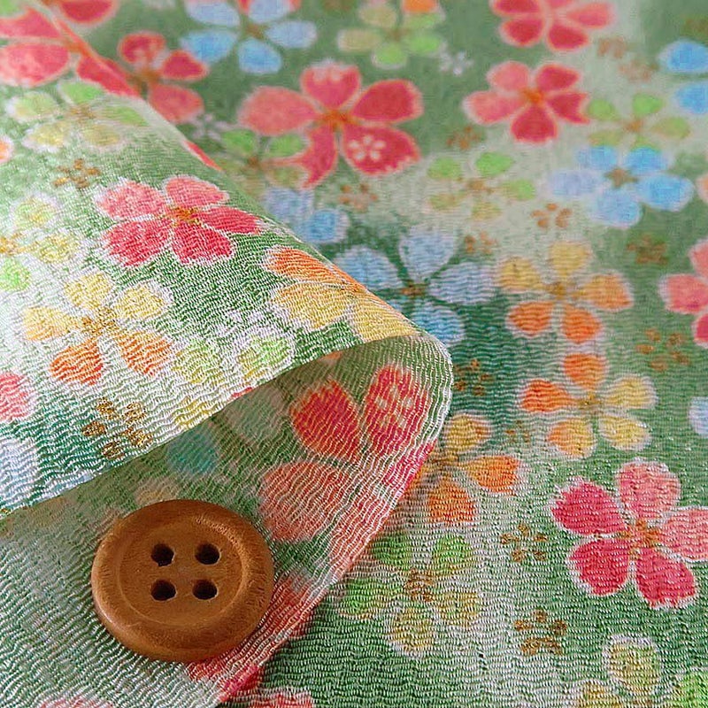 ●この黄緑は、背景が淡い黄緑で、そこにくすんだトーンの黄緑色のぼかし模様が入っています。桜の花は黄色、水色、グリーン、ピンクです。水彩調のほんわかとした優しい色合いがきれいです。