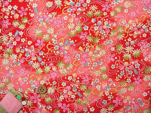 ちりめん生地・流水に花とくし柄(赤) 10cm単位 切り売り