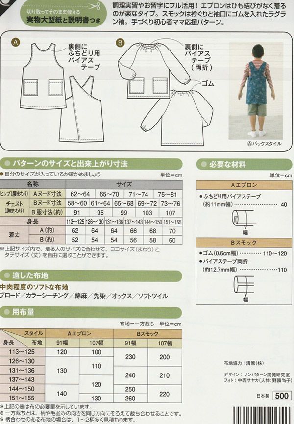 こどものエプロンパターン♪ 実物大型紙・小学生 エプロンとスモック