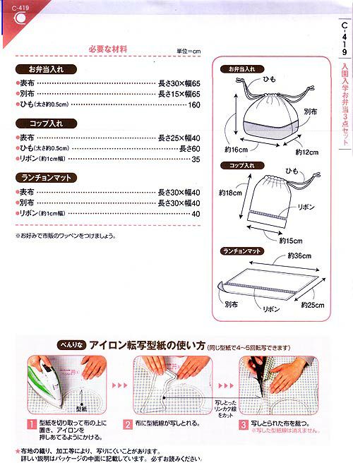 商品案内 入園、入学の準備に。お弁当入れ・コップ入れ・ランチョンマットの3点が作れる型紙です。