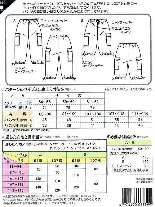 大きなポケットと、コードストッパー付きの丸ゴムを通したウエストと裾口…ちょっぴり背のびした型。でも安心してつくれます。