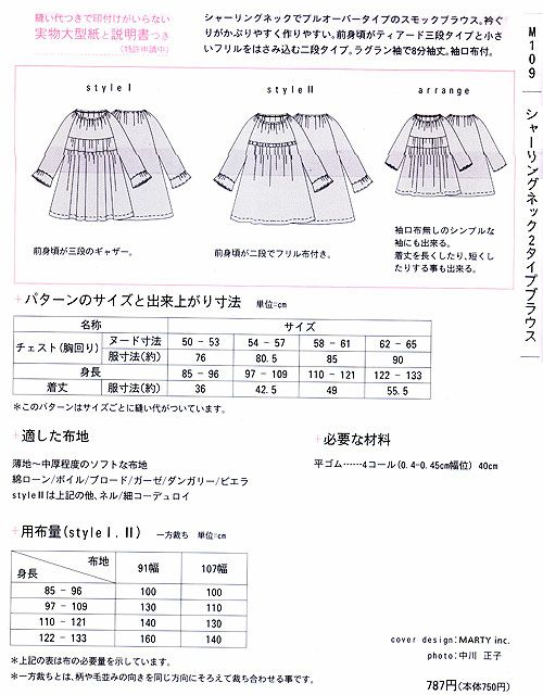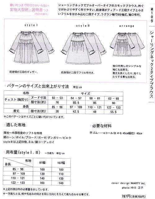 商品案内 シャーリングネットでプルオーバータイプのスモックブラウス。衿ぐりがかぶりやすく作りやすいです。前身頃がティアード三段タイプと小さいフリルをはさみ込む二段タイプ。ラグラン袖で8分袖丈。袖口布付。
