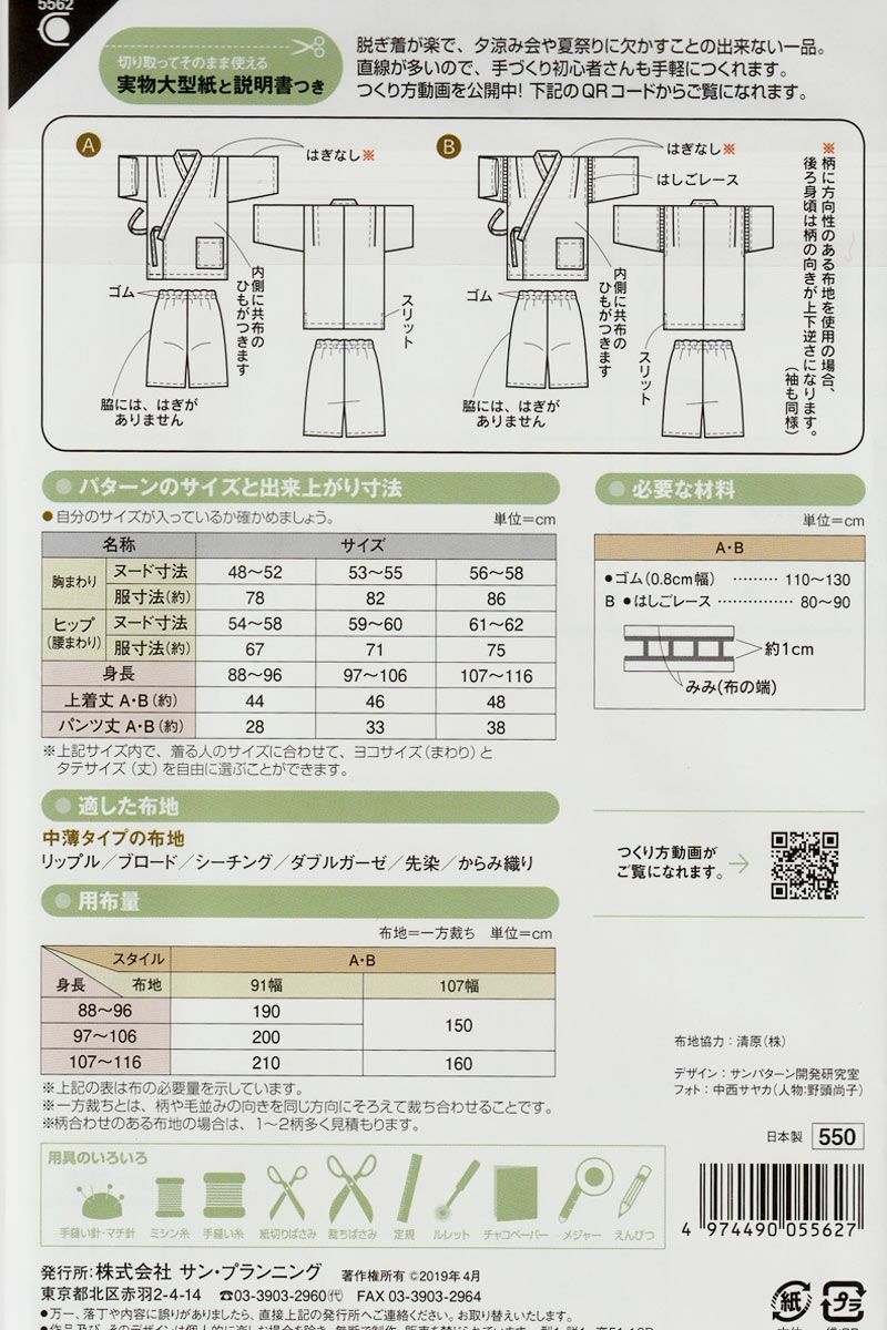 商品案内脱ぎ着が簡単で、夕涼み会や夏祭りにかかすことができないじんべい。今や夏の定番ですね。直線部分が多いので、手作り初心者さんも気軽に作れます。