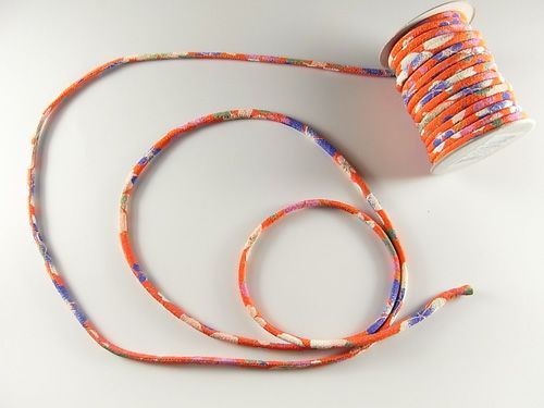渋くモダンな和風柄。 ちりめん丸ひも・柄・3ミリ(実寸約4ミリ) 渦桜・黒 10cm単位 切り売り