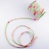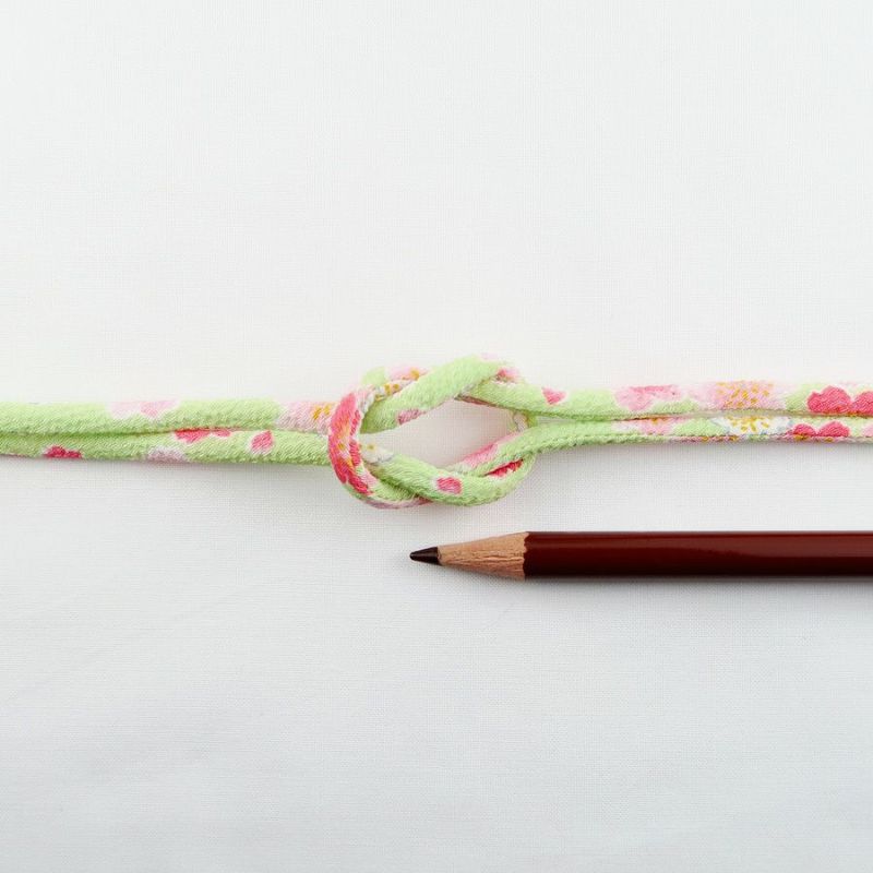 ●中の芯(アクリル毛糸使用)は直径3ミリほどですが、その外側に布があるので実サイズはもう少し太めになります。そのまま見ると3ミリというほどには細く見えませんが、中の芯は細く、手でつまんだりすると細くなりますから、とんぼ玉などを通してチョーカーに使うこともできます。見た目は、手帳等についている携帯用の鉛筆ぐらいの太さでしょうか。ひとつ太いサイズの4ミリに近いですが、やはりこの3ミリの方が細いです。