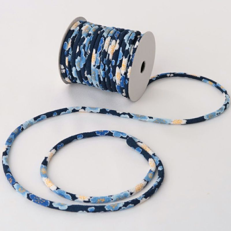 華やかな色合いの桜柄ちりめん丸紐 ちりめん丸ひも・柄・4ミリ(実寸約5-6ミリ) 春爛漫・黄緑 10cm単位 切り売り