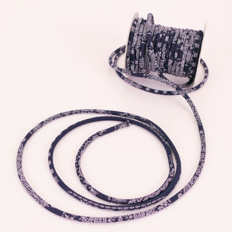 おしゃれで洗練されたデザインの木綿ひも 木綿の丸ひも・洋風柄・4ミリ(実寸約4-5ミリ) ペイズリー・ネイビー 10cm単位 切り売り
