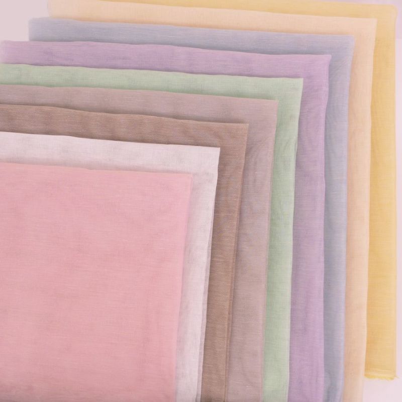 現代の用途に合うよう、たて糸は白、横糸に色糸を使用することで、やわらかい色に仕上がっています。目が粗いので数枚重ねて使うのが一般的ですが、同じ色だけでなく違う色を重ねることで、まじり合う色のニュアンス・奥行きを楽しむこともできます。