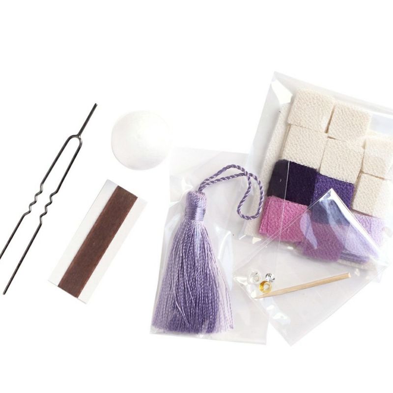 使用する一越ちりめん生地はカット済み、タッセル(房)は完成済みなので、すぐに作り始めることができます。カジュアルにもフォーマルにも合わせられる豪華なかんざしを、ぜひ手作りしてみてください。
