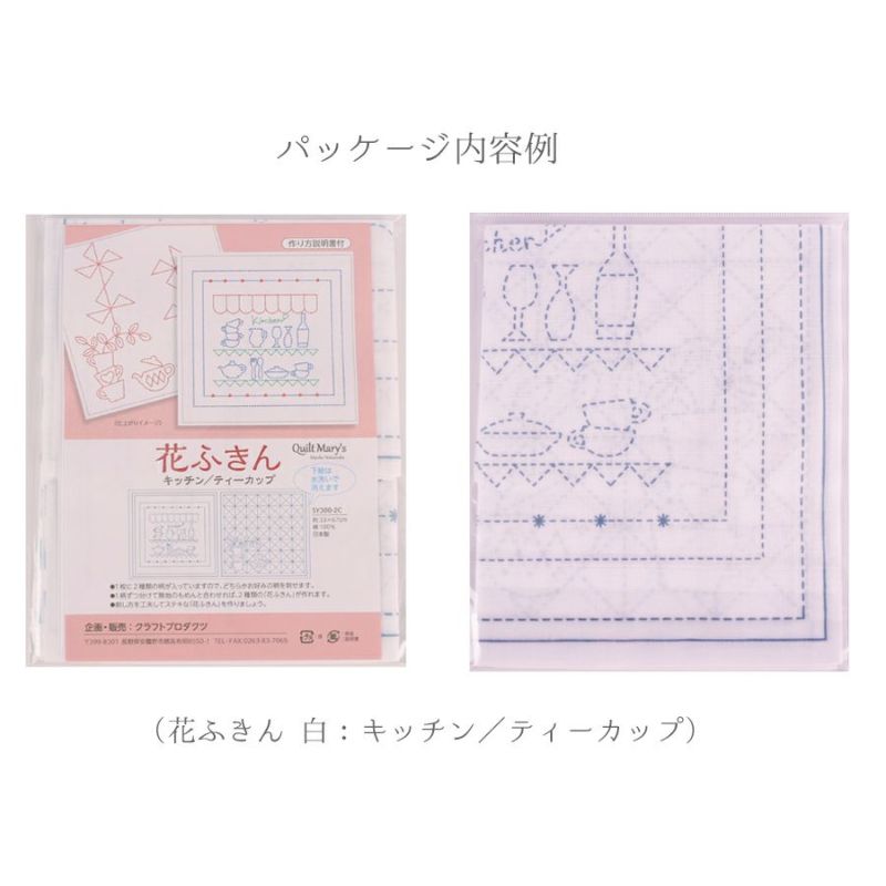 ○2種類の柄のうち、お好きな方を選んでお使いください。プリントされている下絵は水洗いで消えるので、使わないもう一方の柄は水洗いすると消えます。