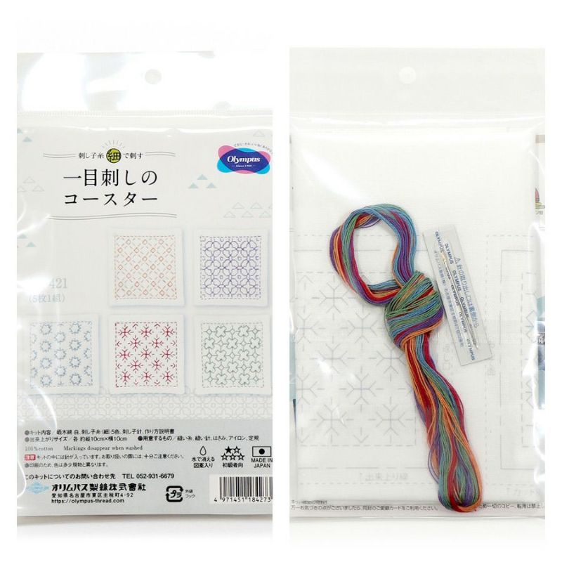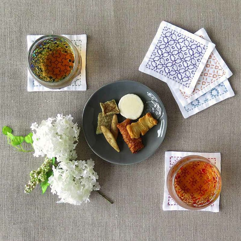 すべて違う柄のひとめざしキット 刺し子キット 一目刺しのコースター(生成り/5枚1組) 星と三つ菱・ニンジンほか