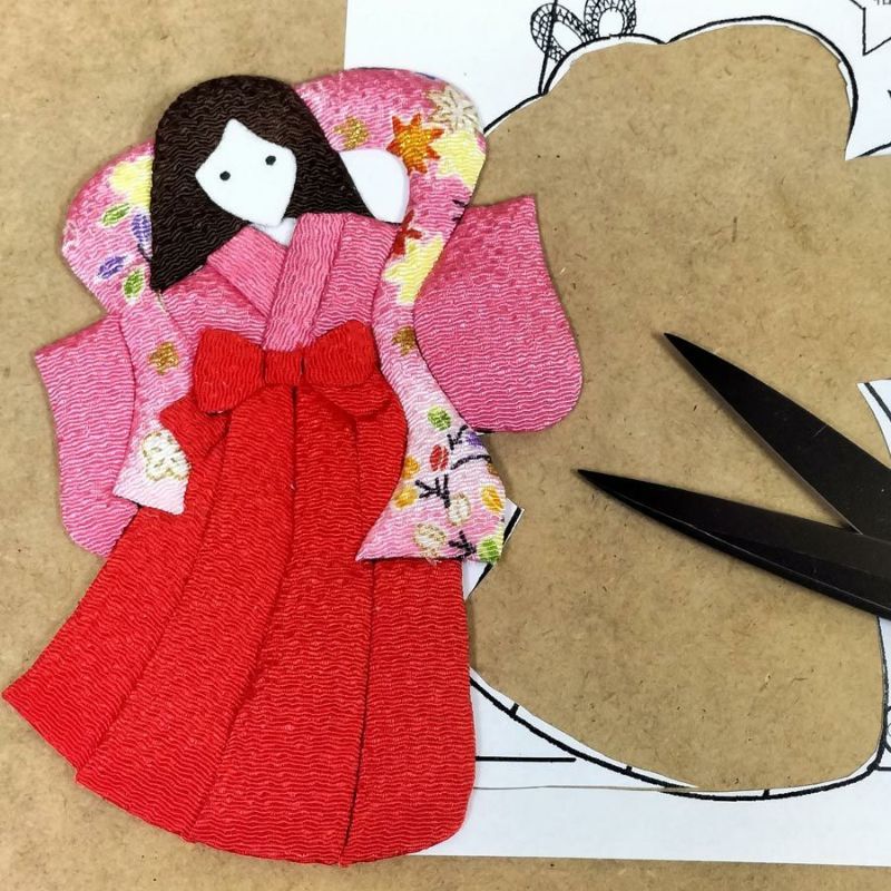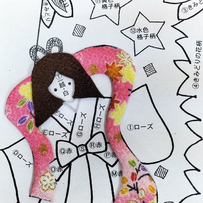 ●キット内容:ちりめん生地、ちりめんシール、白ボール紙、黒紙、紐、ウレタン付きボール紙、カットビーズ、金紙、頬紅(綿棒)、図案、作り方説明書