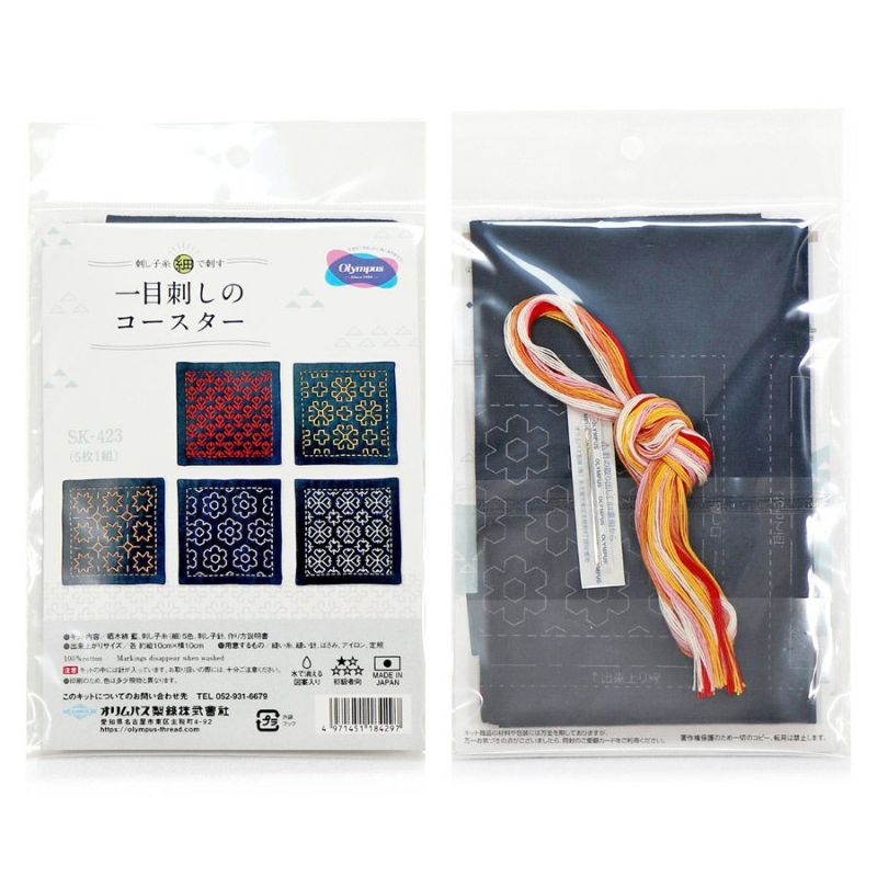すべて違う柄のひとめざしキット 刺し子キット 一目刺しのコースター(生成り/5枚1組) 星と三つ菱・ニンジンほか