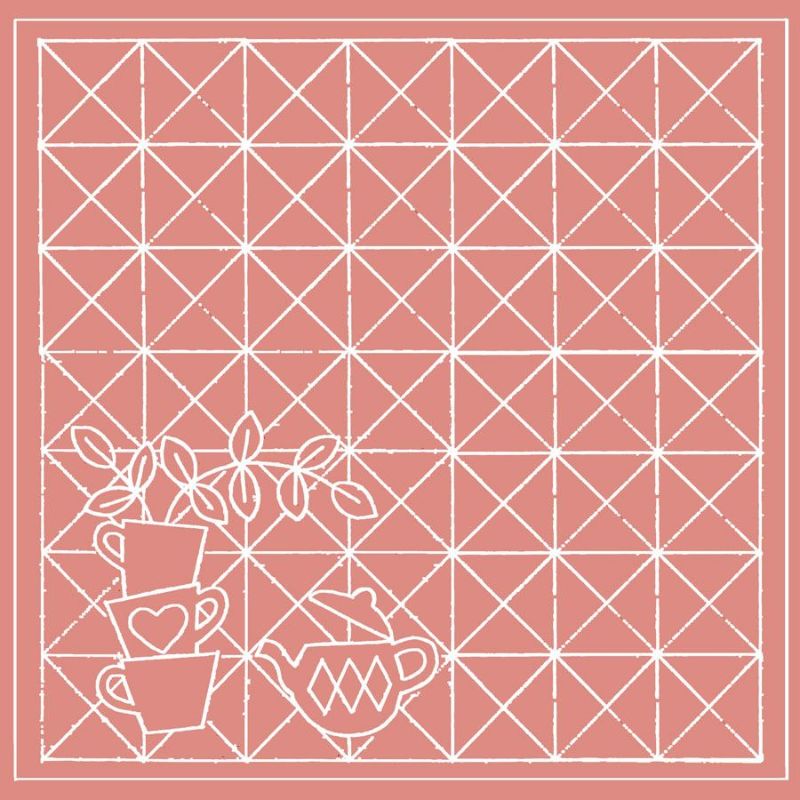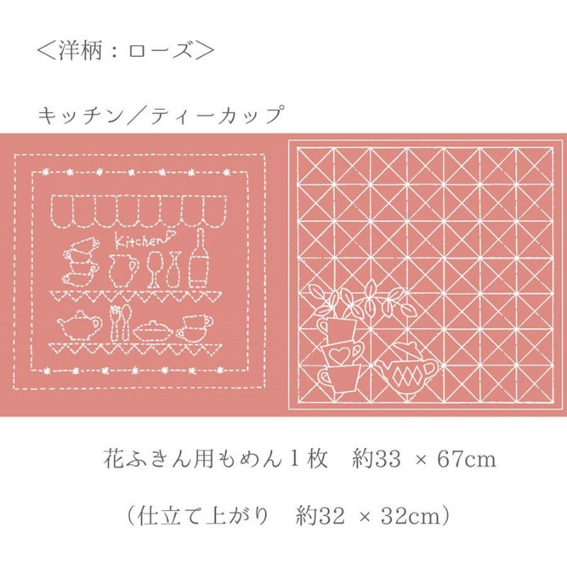 刺し子布 花ふきん (キッチン/ティーカップ) ローズ 刺子用生地 さしこ用布地 キッチン柄 ティーカップ柄 ピンク色