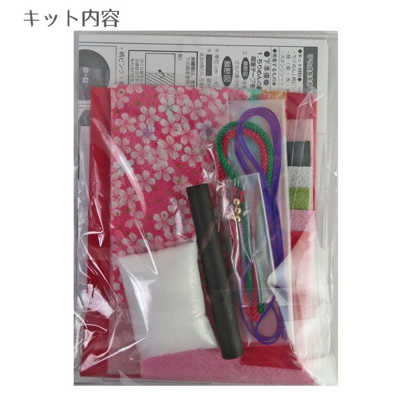 ●キット内容:ちりめん、シーチング、紐(紫・赤・緑)、スポンジシート、金ビーズ、黒棒、型抜き済みボール紙、綿、刺し目(赤)、作り方説明書