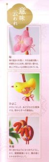○吊るしモチーフには一つ一つ意味があります。『桜』には事の始まりを祝い、その永続を願い栄誉をたたえる、『ひよこ』は可愛らしさ・あどけなさの意味があります。一番下の『草履』には早く歩けますようにとの願いが込められています。