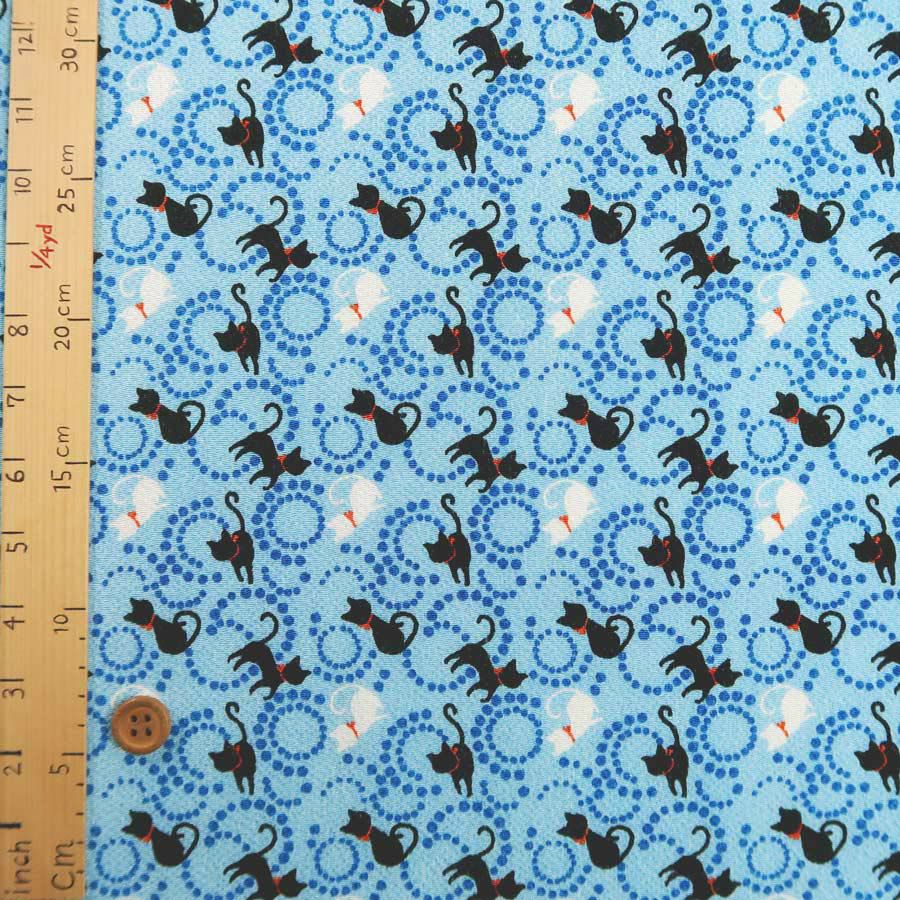 在庫限り/ちりめん生地 おしゃまなネコ(水色) 10cm単位 切り売り
