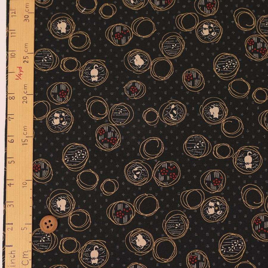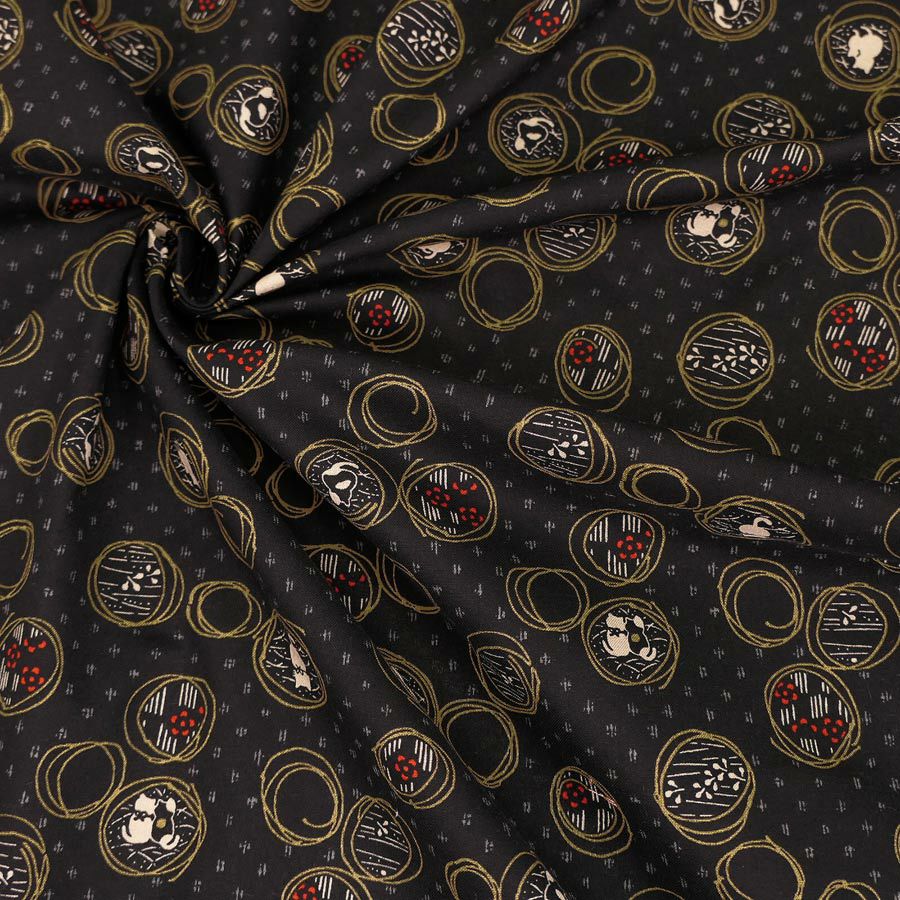 和柄コットン生地 くるくる丸にネコとかすり柄(黒) 10cm単位 切り売り