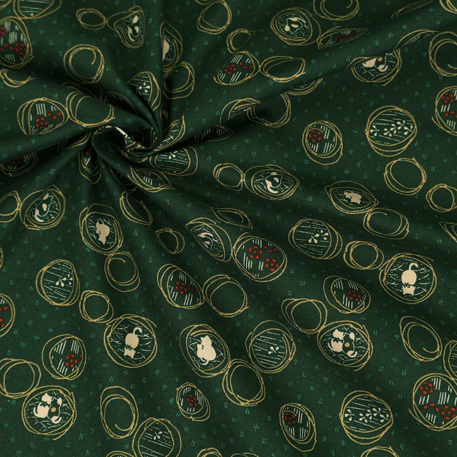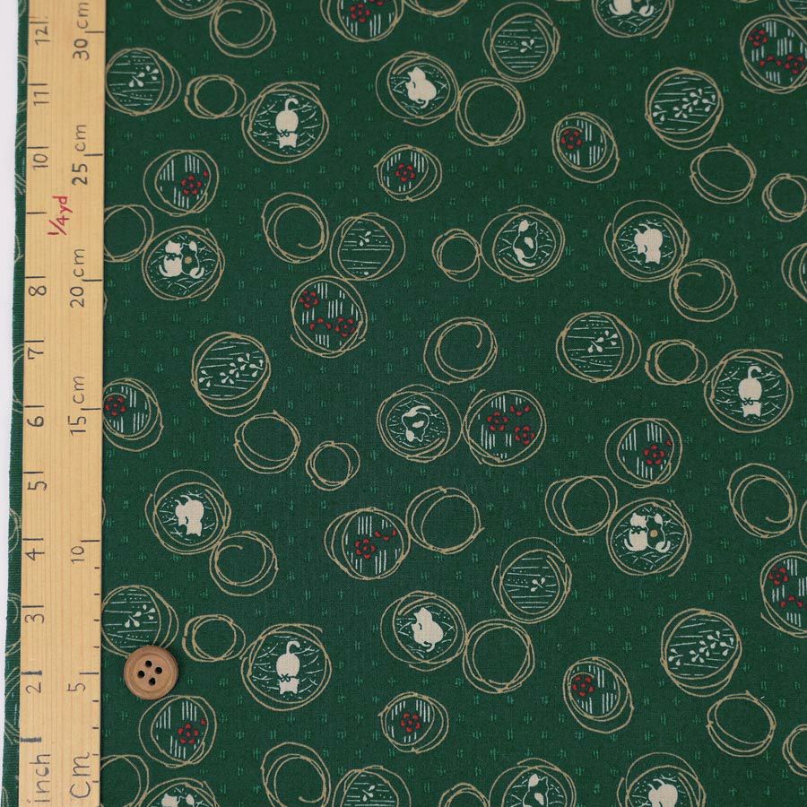 和柄コットン生地 くるくる丸にネコとかすり柄(深緑) 10cm単位 切り売り