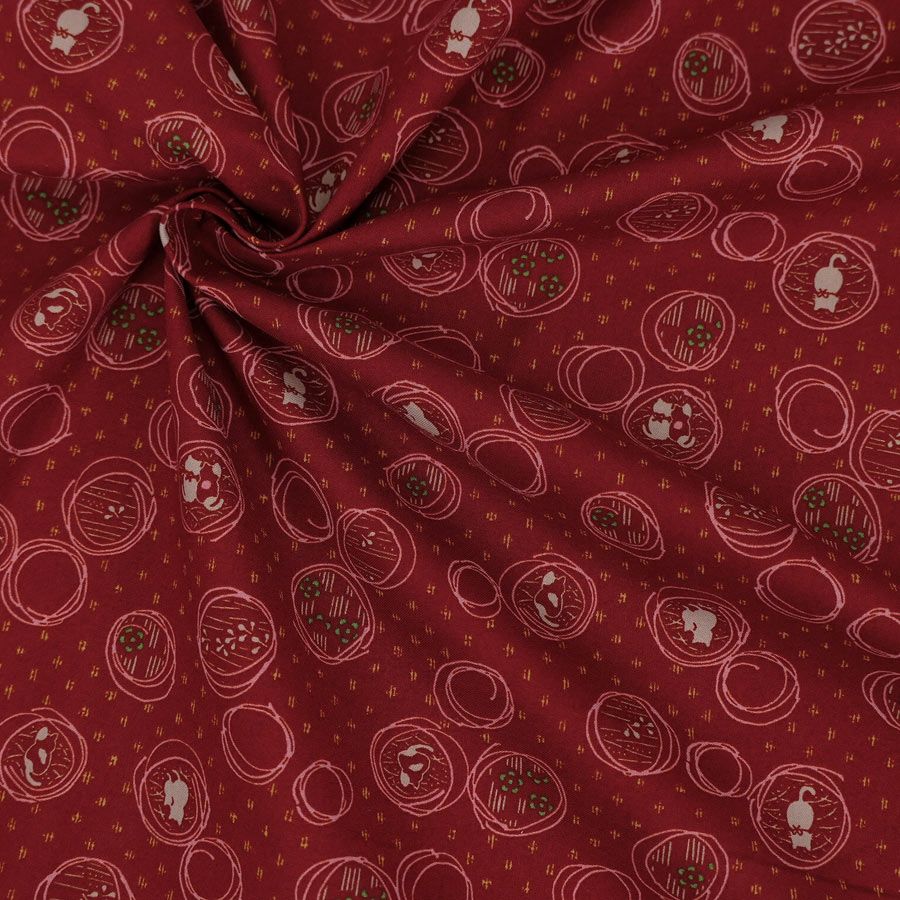 生産終了/在庫限り 和柄コットン生地 くるくる丸にネコとかすり柄(えんじ) 10cm単位 切り売り