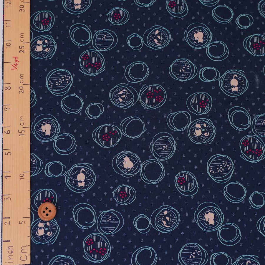 生産終了/在庫限り 和柄コットン生地 くるくる丸にネコとかすり柄(紺) 10cm単位 切り売り