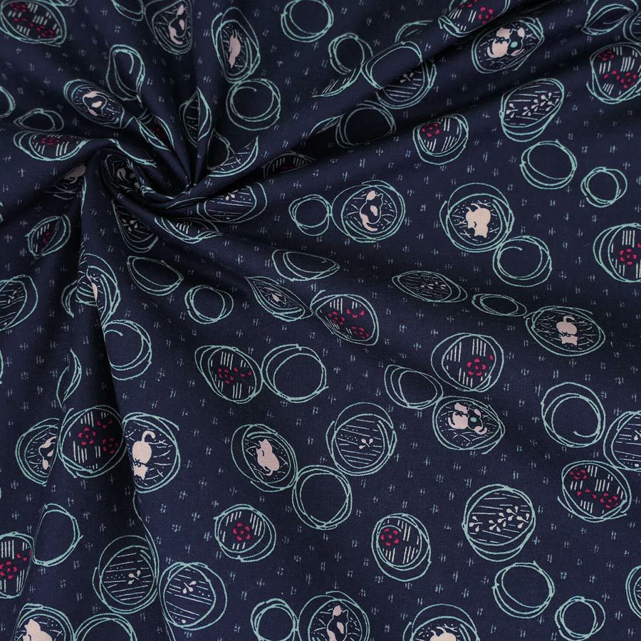 和柄コットン生地 唐草にのんびり猫(紺色) 10cm単位 切り売り