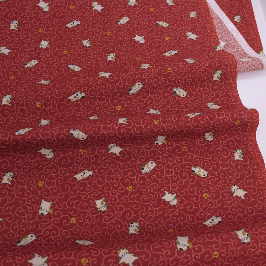 和柄コットン生地 招き猫に小判(れんが色) 10cm単位 切り売り