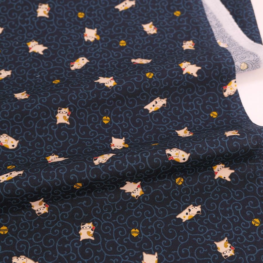 和柄コットン生地 招き猫に小判(青) 10cm単位 切り売り