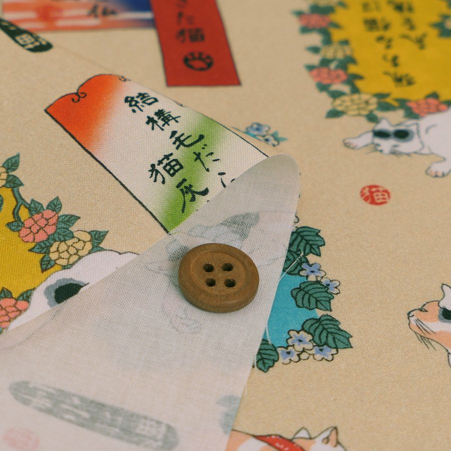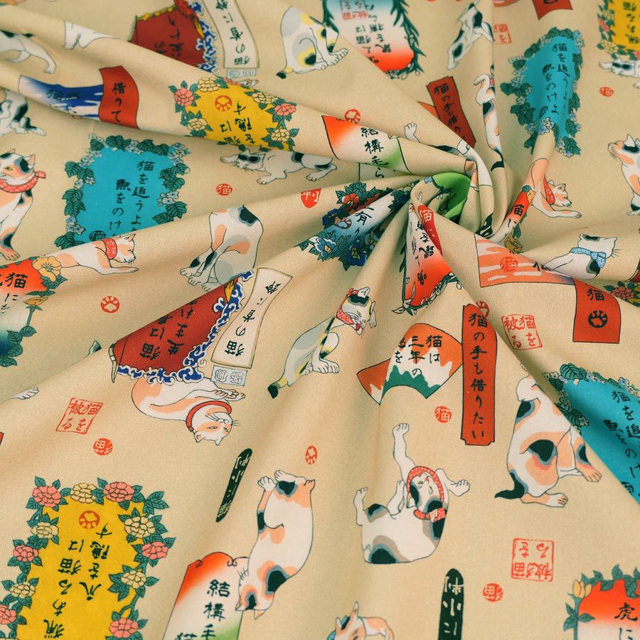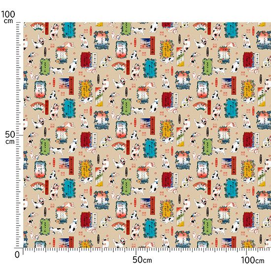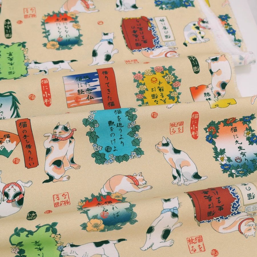 生産終了/在庫限り 和柄コットン生地 猫とことわざ(ベージュ) 10cm単位 切り売り