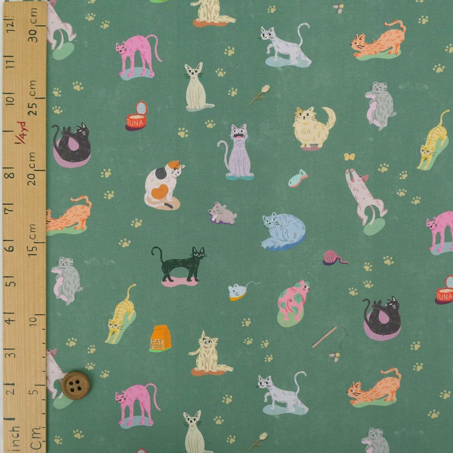 コットン生地 からふる猫の自由な日々(グリーン) 10cm単位 切り売り