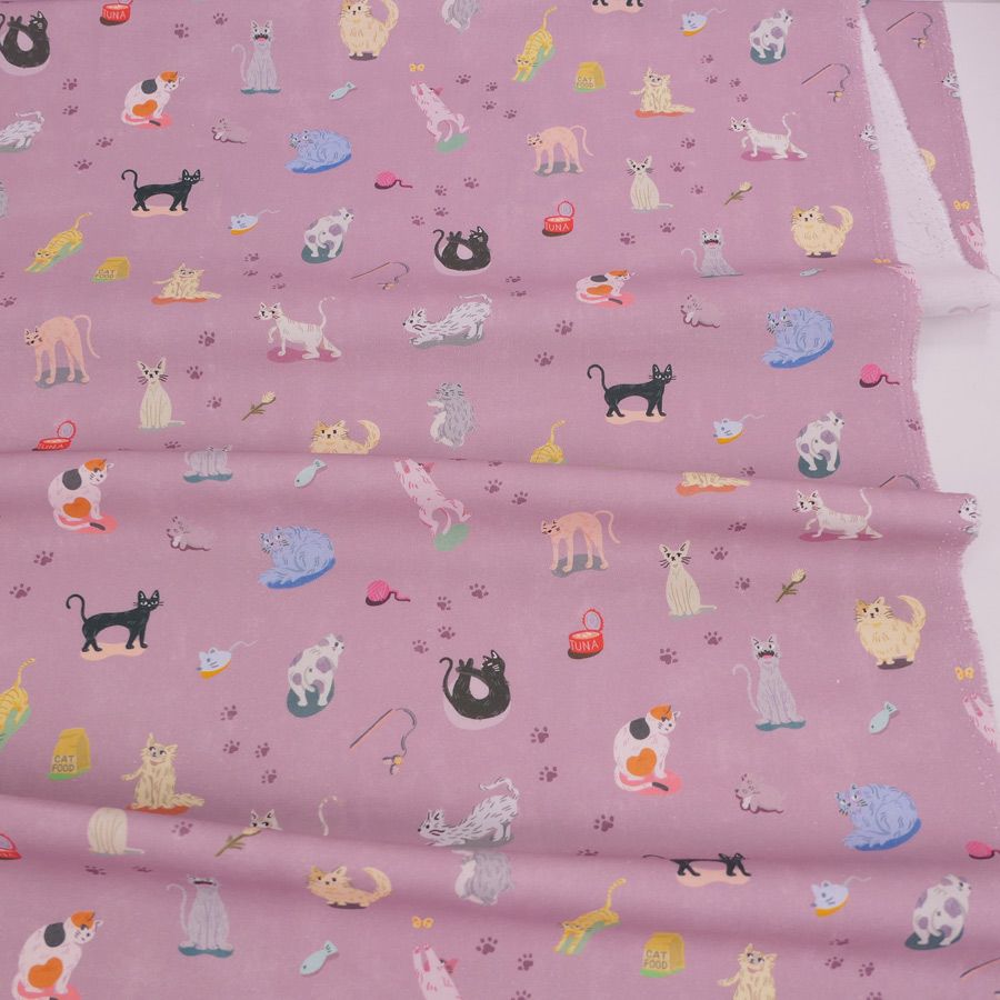 コットン生地 からふる猫の自由な日々(グレイッシュピンク) 10cm単位 切り売り