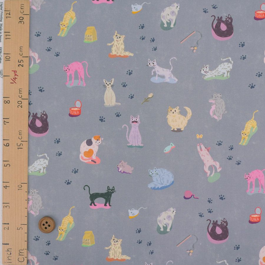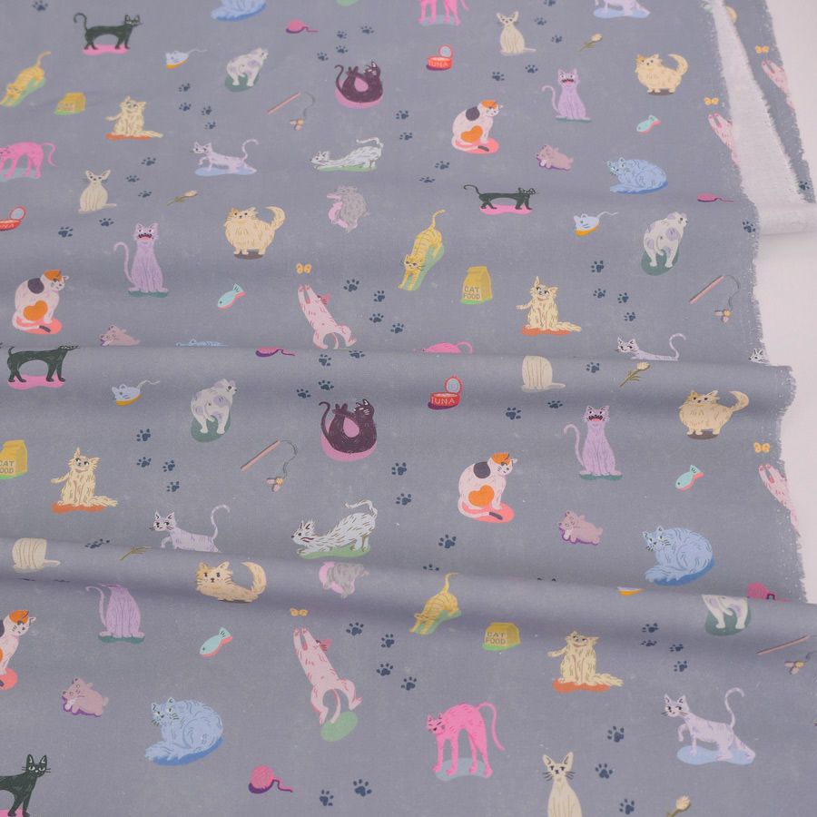 コットン生地 点描に猫の日常(グレー/ブルー) 10cm単位 切り売り