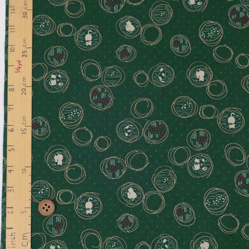 和風小物のハンドメイドにも 和柄コットン生地 くるくる丸にネコとかすり柄(深緑) 10cm単位 切り売り