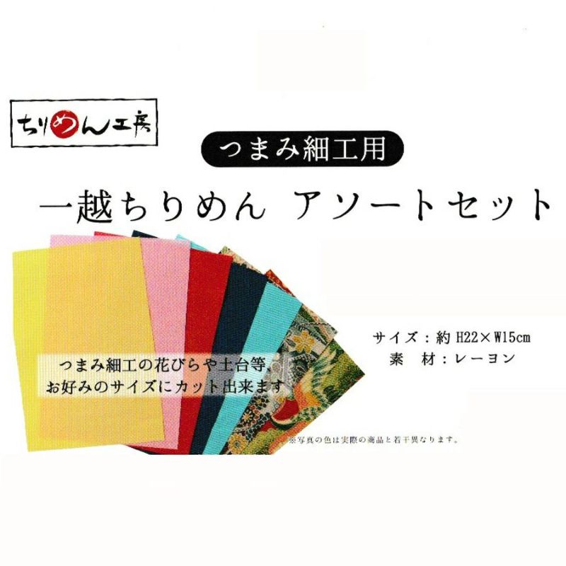 商品案内つまみ細工やちりめん手芸に!一越ちりめんの小さめカットクロスを無地と柄をとりまぜた7枚セットで。とりあえず無地と柄を少しずつそろえたい場合に重宝です。