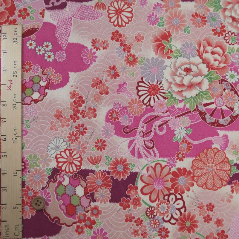 古布調の縮緬、手芸に。 一越ちりめん・青海波に御所車(赤/紫) 10cm単位 切り売り