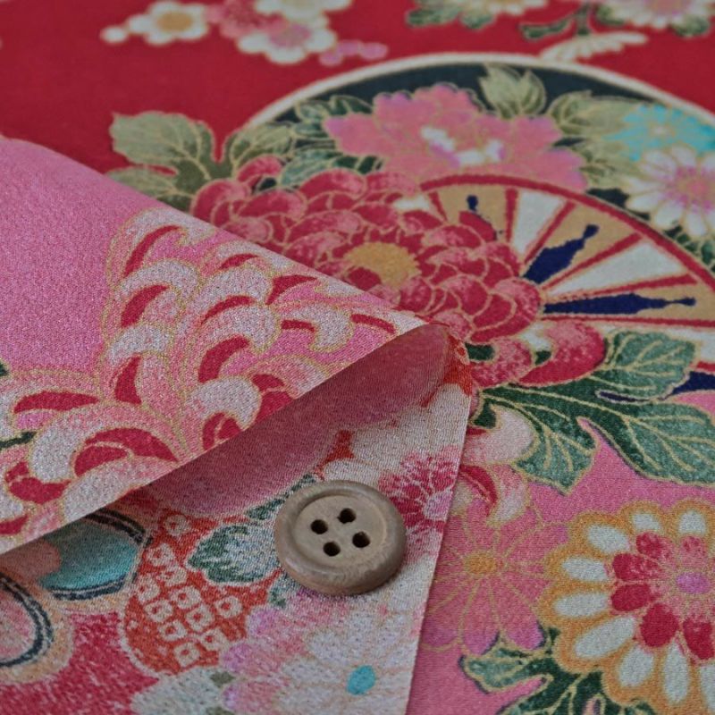 古布のような古典柄縮緬 一越ちりめん生地 疋田雲に鶴と菊(黒/柿色) 10cm単位 切り売り