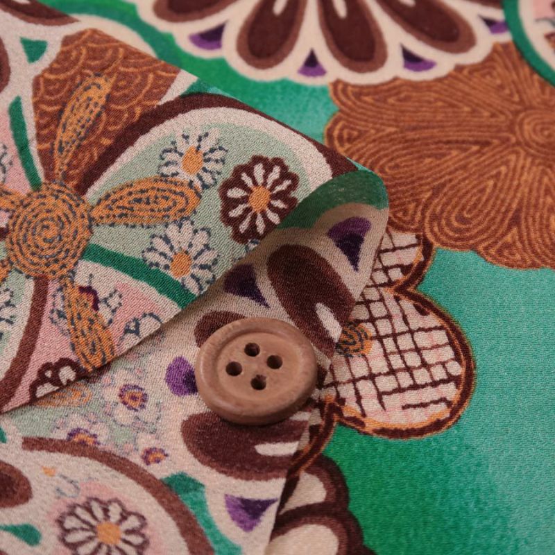 このちりめんは手捺染という技法で染められたものです。これは布の上に型を置き、人の手によって染めていく方法です。機械で染めるよりもはるかに手間がかかりますが、深みのある精巧な染めが可能です。実物をご覧いただくと納得していただけると思います。